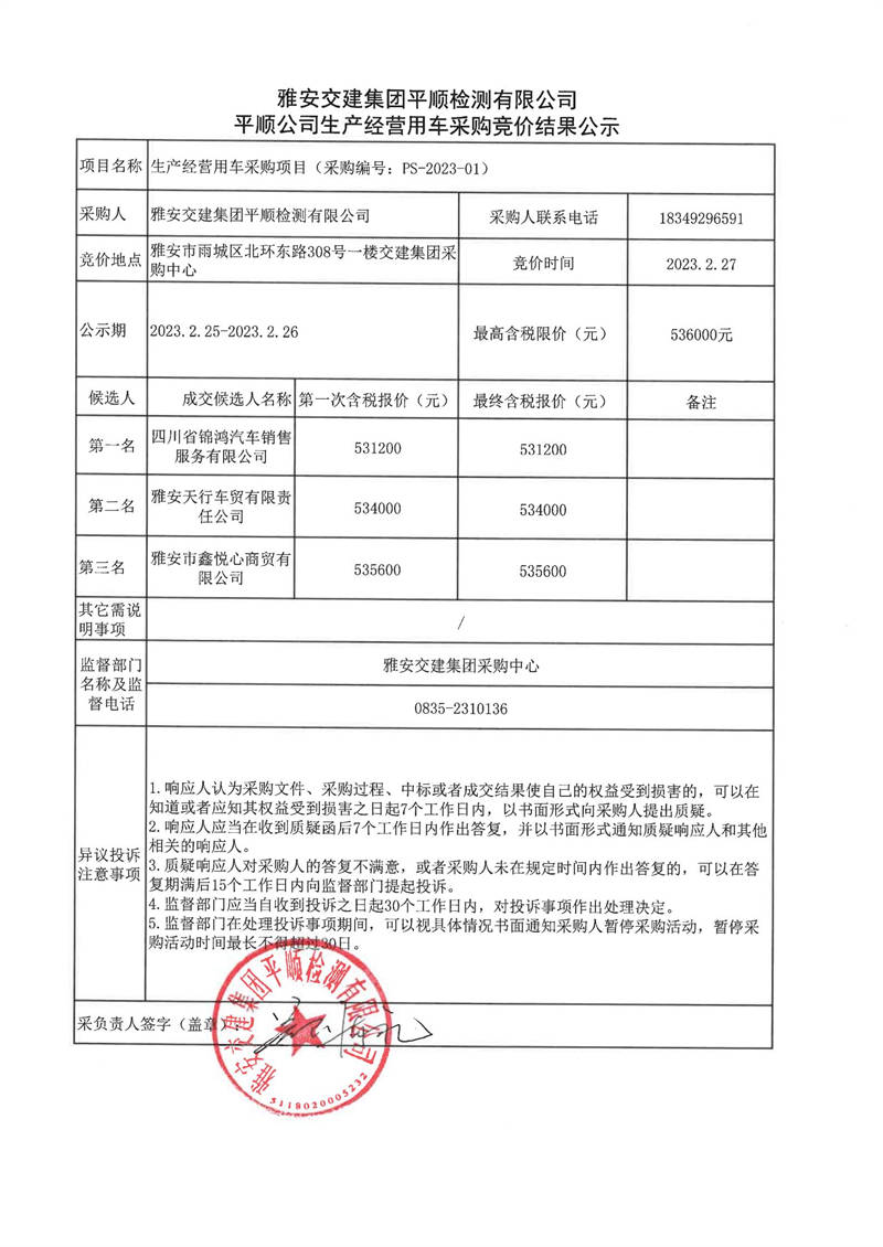 雅安交建集團平順檢測有限公司平順公司生產(chǎn)經(jīng)營用車采購競價結果公示