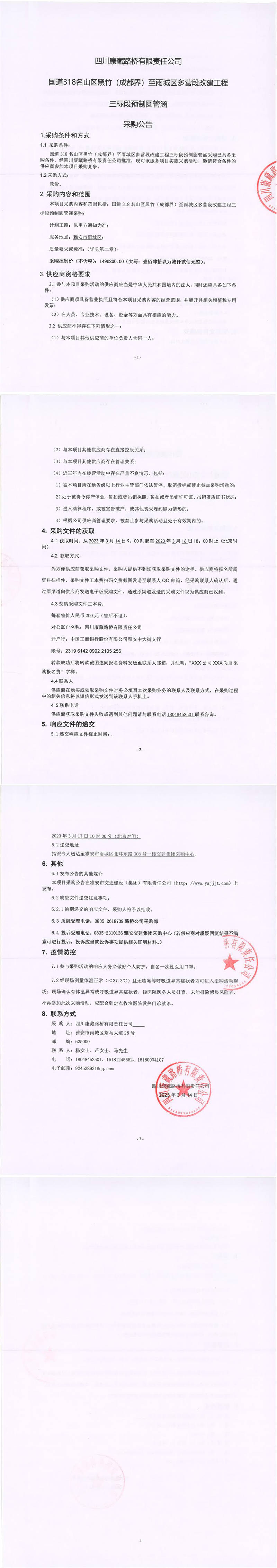 四川康藏路橋有限責任公司國道318名山區(qū)黑竹(成都界)至雨城區(qū)多營段改建工程三標段預(yù)制圓管涵采購公告