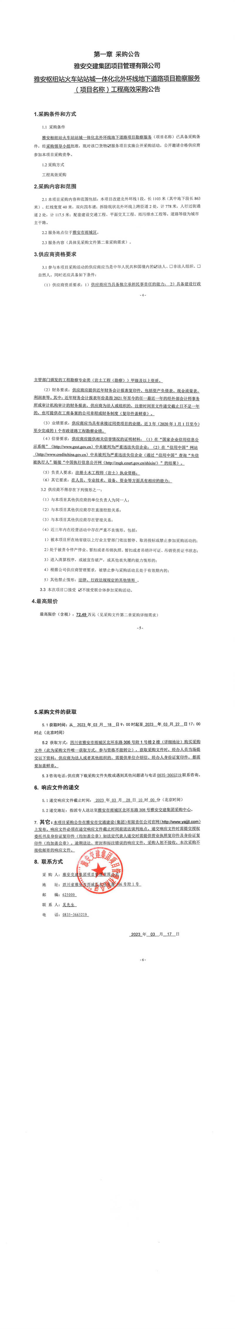 雅安交建集團(tuán)項(xiàng)目管理有限公司雅安樞紐站火車站站城一體化北外環(huán)線地下道路項(xiàng)目勘察服務(wù)(項(xiàng)目名稱)工程高效采購公告