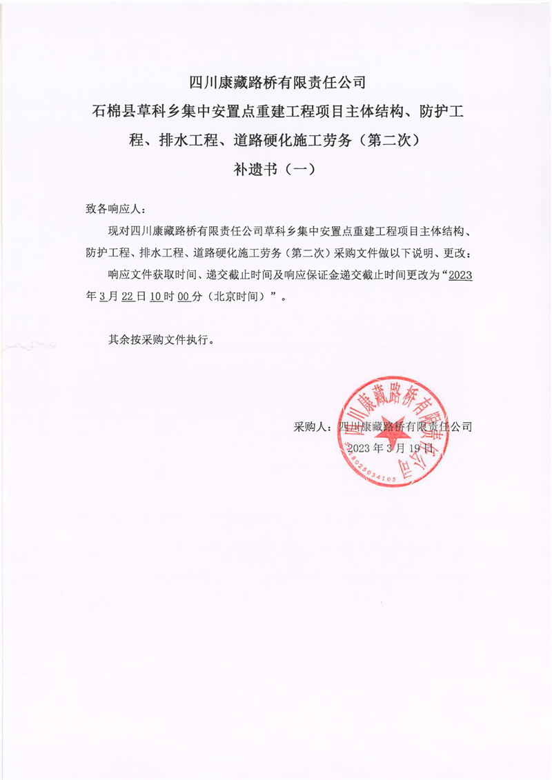 四川康藏路橋有限責(zé)任公司石棉縣草科鄉(xiāng)集中安置點重建工程項目主體結(jié)構(gòu)、防護(hù)工程、排水工程、道路硬化施工勞務(wù)(第二次)補(bǔ)遺書(一)