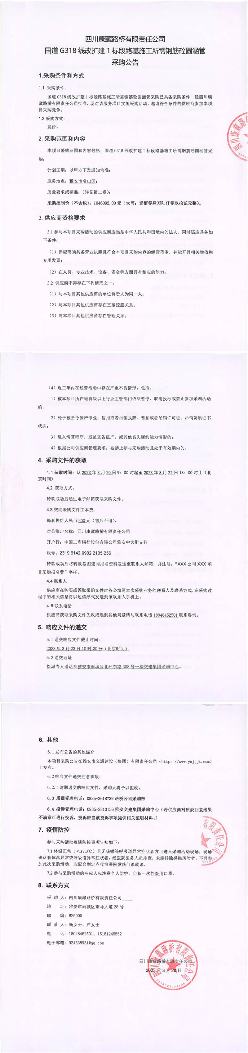 四川康藏路橋有限責(zé)任公司國道G318線改擴建1標段路基施工所需鋼筋砼圓涵管采購公告