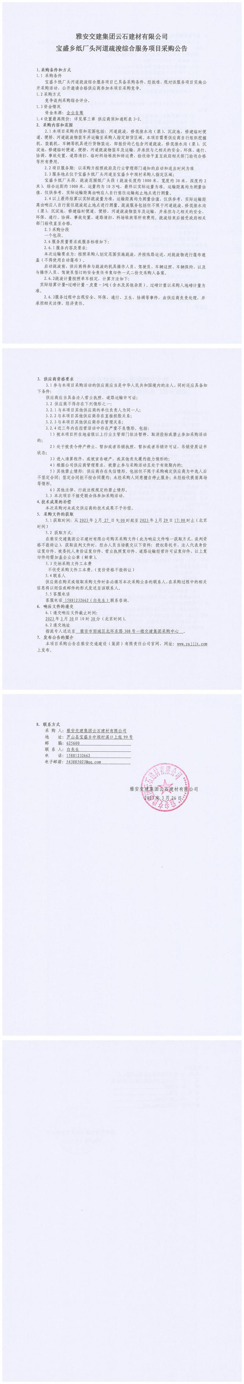 雅安交建集團(tuán)云石建材有限公司寶盛鄉(xiāng)紙廠頭河道疏浚綜合服務(wù)項目采購公告