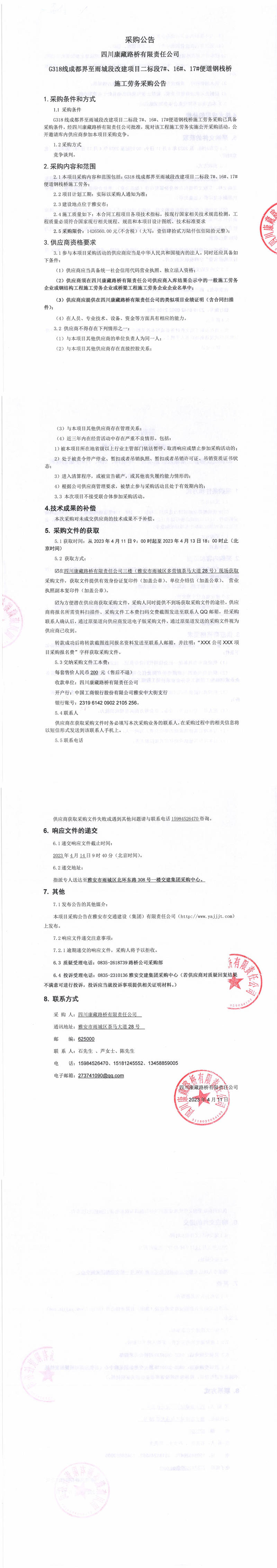 四川康藏路橋有限責(zé)任公司G318線成都界至雨城段改建項(xiàng)目二標(biāo)段7#、16#、17#便道鋼棧橋施工勞務(wù)采購(gòu)公告