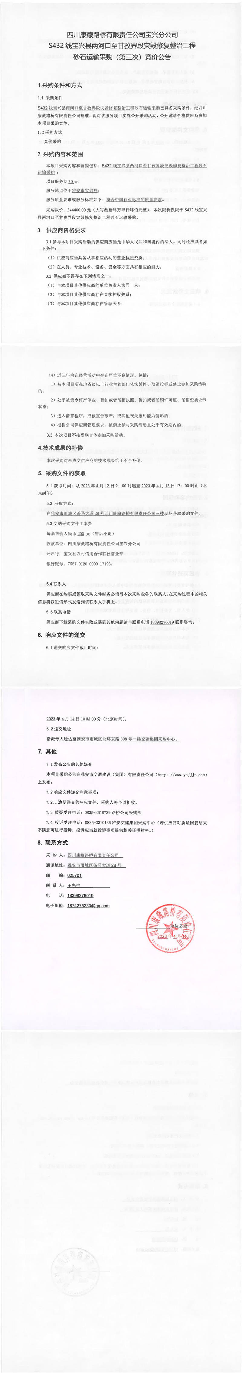 四川康藏路橋有限責(zé)任公司寶興分公司S432寶興縣兩河口至甘孜界段災(zāi)毀修復(fù)整治工程砂石運(yùn)輸采購(第三次)競(jìng)價(jià)公告
