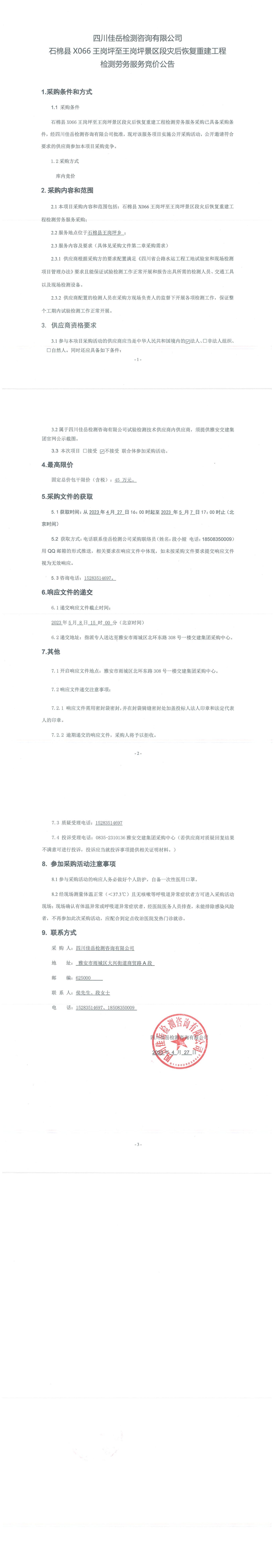 四川佳岳檢測咨詢有限公司石棉縣X066王崗坪至王崗坪景區(qū)段災(zāi)后恢復(fù)重建工程檢測勞務(wù)服務(wù)競價(jià)公告
