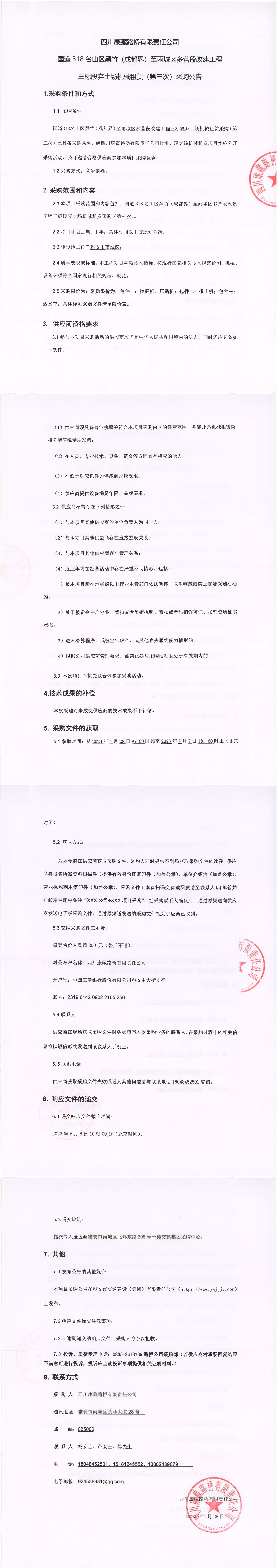 四川康藏路橋有限責任公司國道318名山區(qū)黑竹(成都界)至雨城區(qū)多營段改建工程三標段棄土場機械租賃(第三次)采購公告