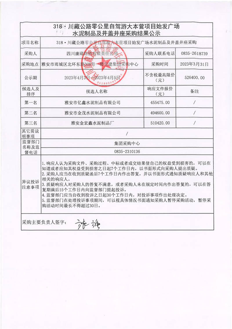 四川康藏路橋有限責(zé)任公司318·川藏公路零公里自駕游大本營項目始發(fā)廣場水泥制品及井蓋井座采購結(jié)果公示