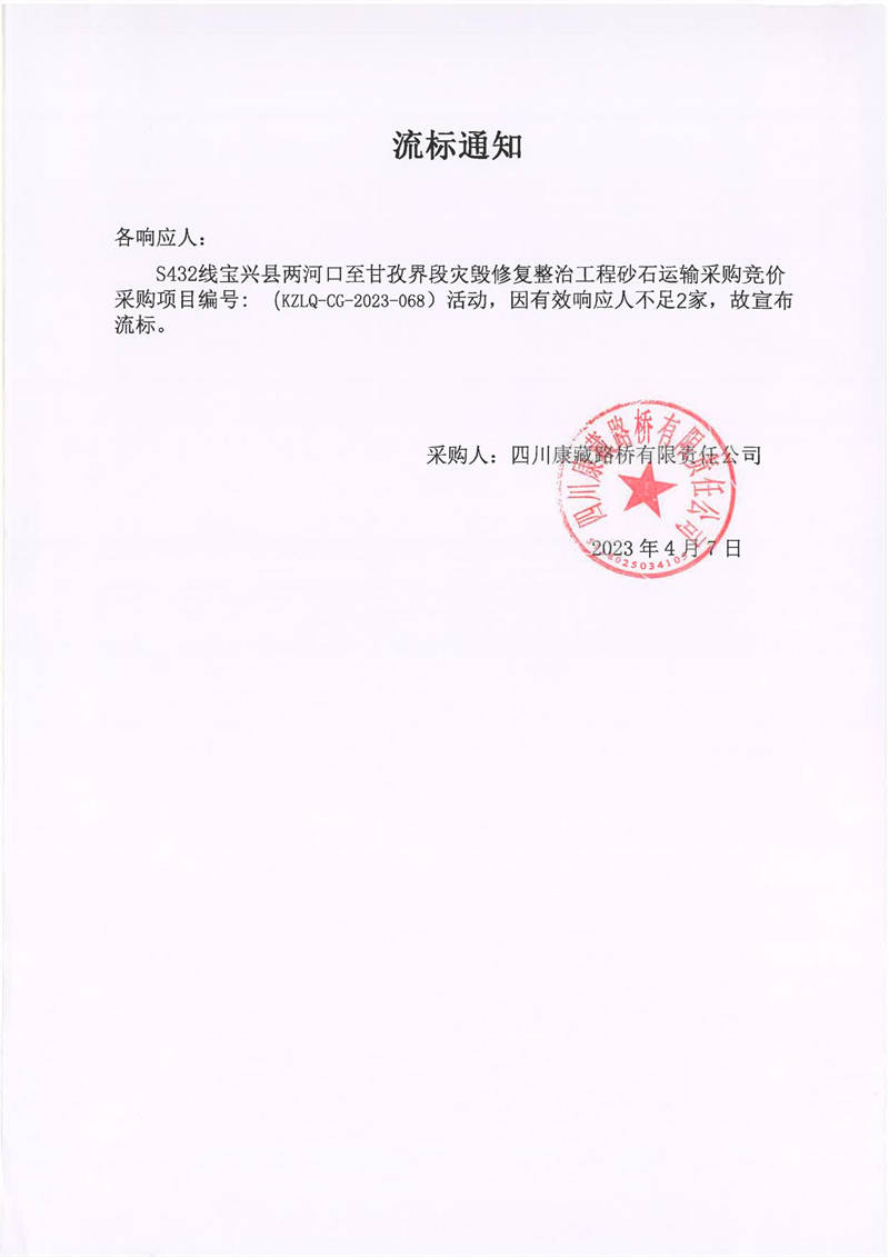 四川康藏路橋有限責(zé)任公司寶興分公司S432寶興縣兩河口至甘孜界段災(zāi)毀修復(fù)整治工程砂石運(yùn)輸采購流標(biāo)通知