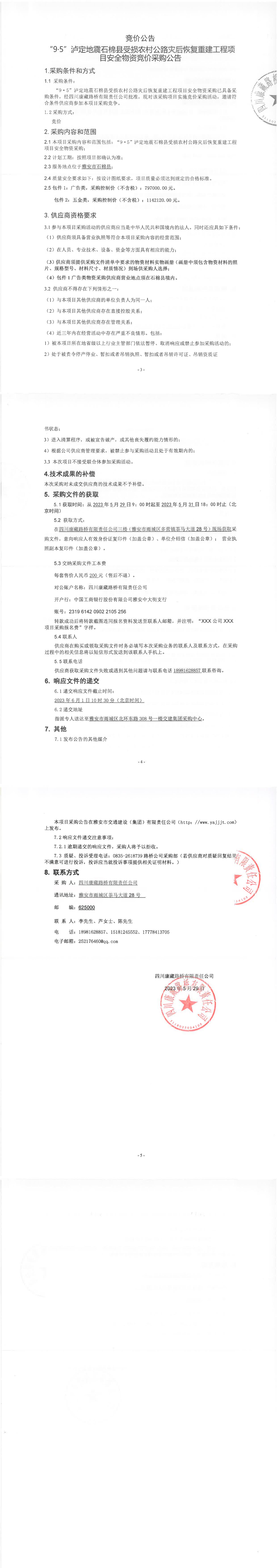 四川康藏路橋有限責(zé)任公司“9.5”瀘定地震石棉縣受損農(nóng)村公路災(zāi)后恢復(fù)重建工程項(xiàng)目安全物資競價(jià)采購公告