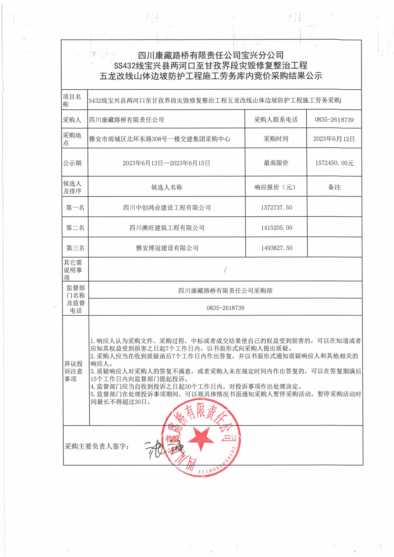 四川康藏路橋有限責(zé)任公司S432線(xiàn)寶興縣兩河口至甘孜界段災(zāi)毀修復(fù)整治工程五龍改線(xiàn)山體邊坡防護(hù)施工勞務(wù)庫(kù)內(nèi)競(jìng)價(jià)采購(gòu)結(jié)果公示