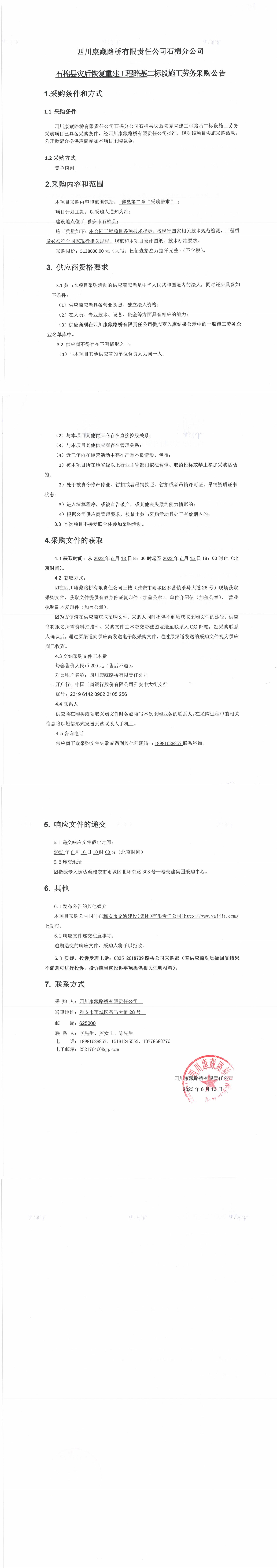四川康藏路橋有限責(zé)任公司石棉分公司石棉縣災(zāi)后恢復(fù)重建工程路基二標(biāo)段施工勞務(wù)采購公告