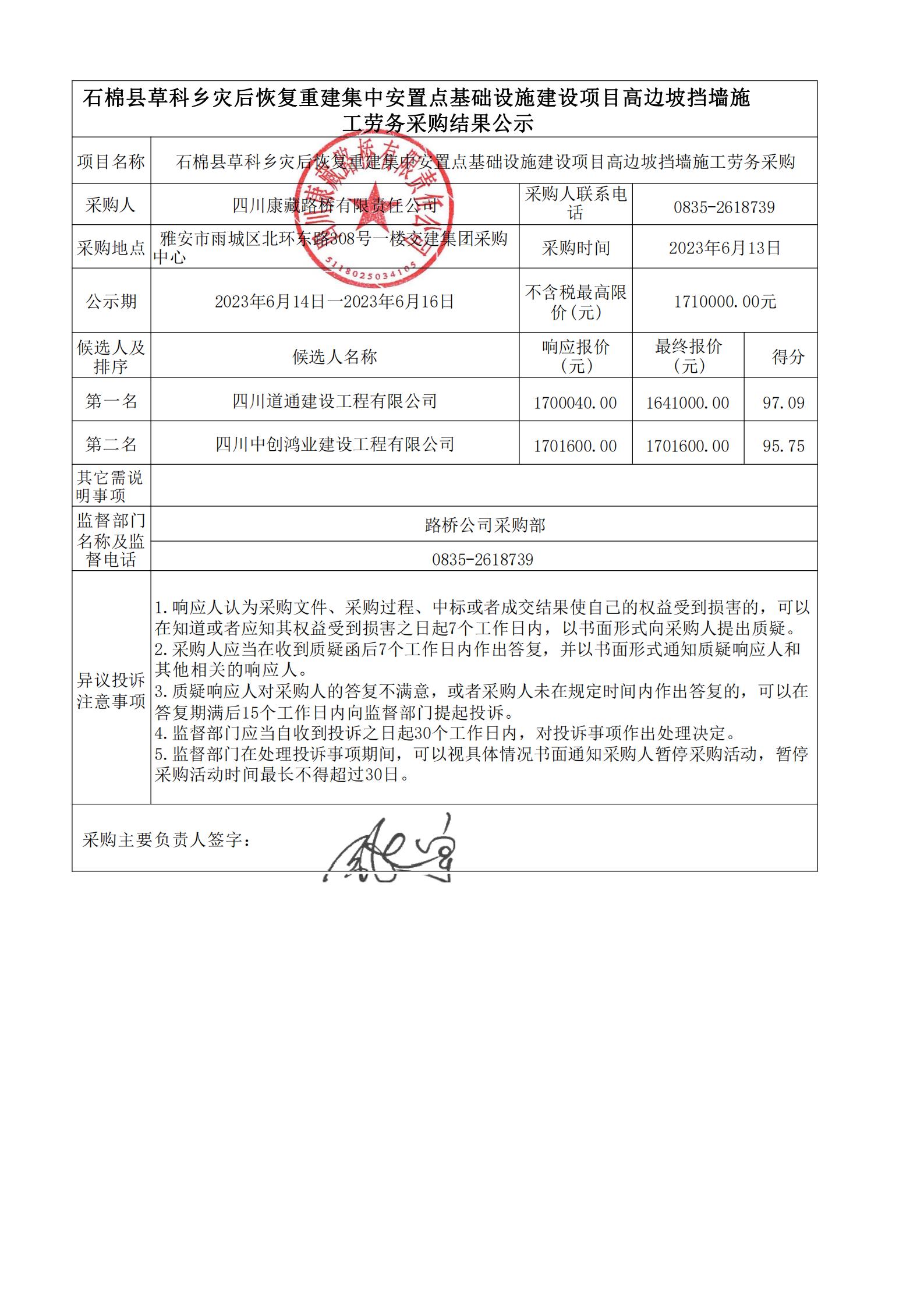 四川康藏路橋有限責(zé)任公司石棉縣草科鄉(xiāng)災(zāi)后恢復(fù)重建集中安置點基礎(chǔ)設(shè)施建設(shè)項目高邊坡?lián)鯄κ┕趧?wù)采購結(jié)果公示