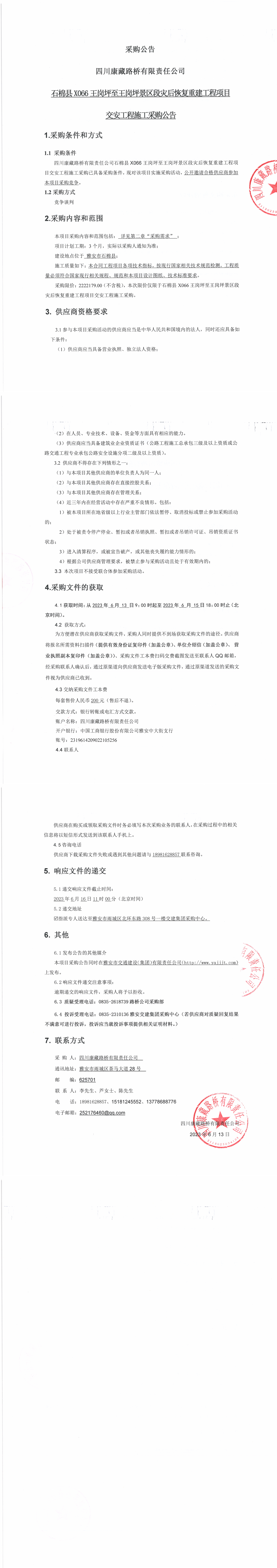 四川康藏路橋有限責任公司石棉縣X066王崗坪至王崗坪景區(qū)段災(zāi)后恢復(fù)重建工程項目交安工程施工采購公告