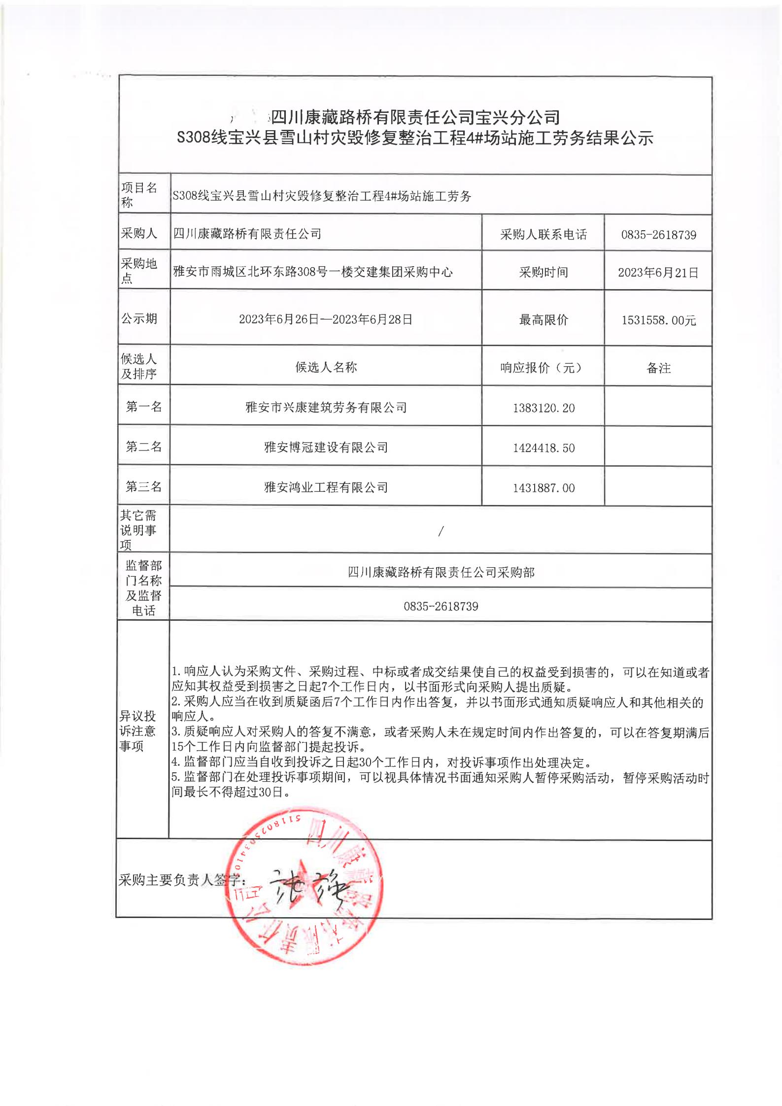 四川康藏路橋有限責(zé)任公司寶興分公司S308線寶興縣雪山村段災(zāi)毀修復(fù)整治工程4#場站施工勞務(wù)結(jié)果公示