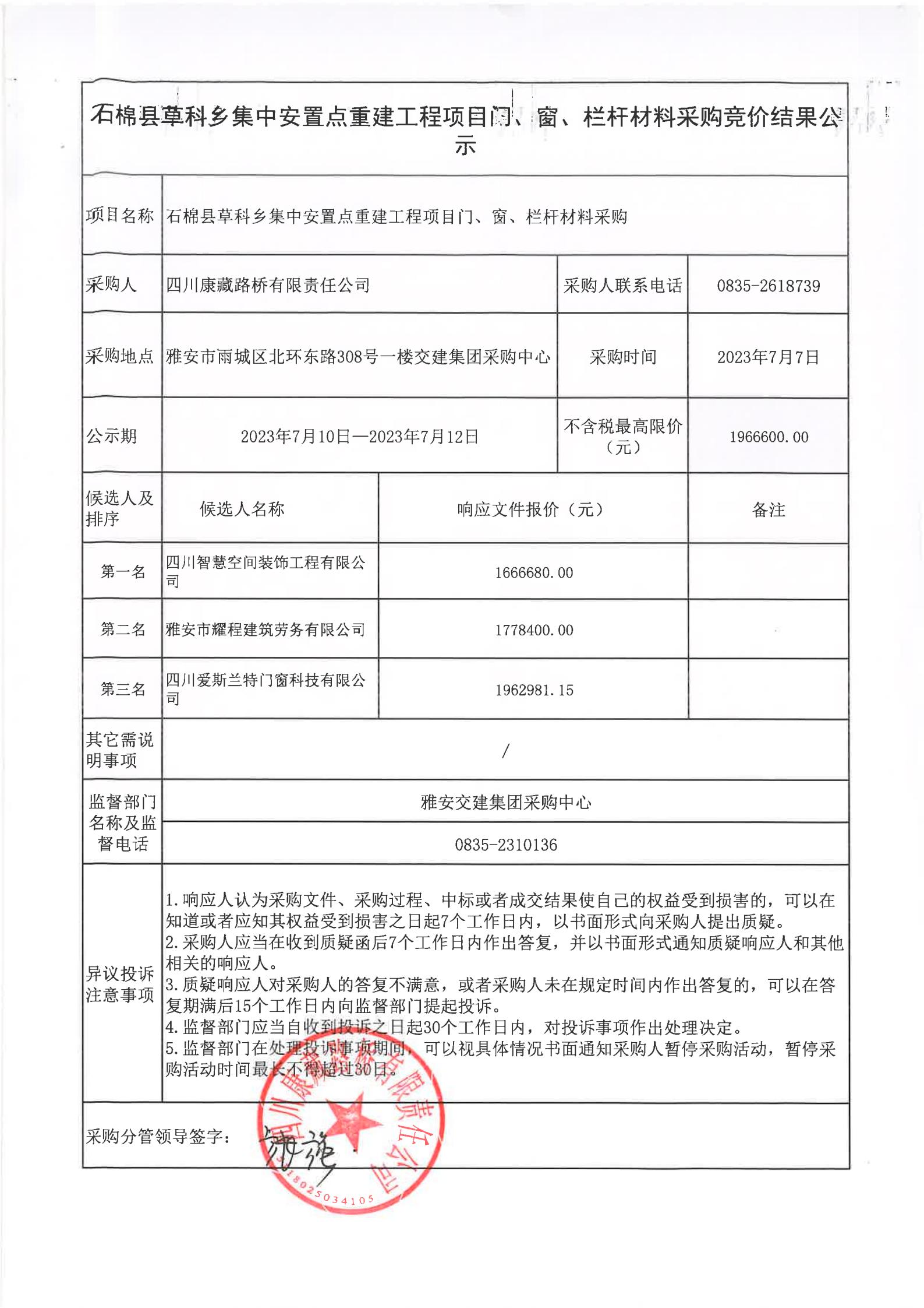 四川康藏路橋有限責任公司石棉草科鄉(xiāng)集中安置點重建工程項目門、窗、欄桿材料采購競價結(jié)果公示