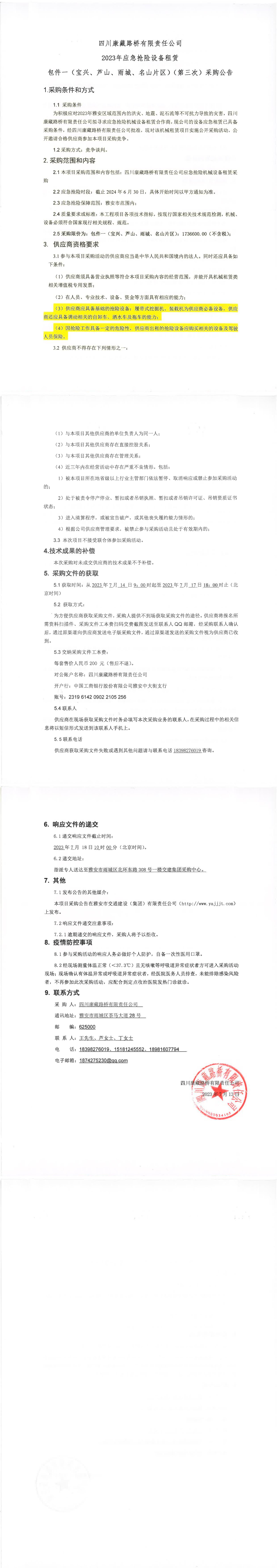 四川康藏路橋有限責(zé)任公司2023年應(yīng)急搶險(xiǎn)設(shè)備租賃包件一(寶興、蘆山、雨城、名山片區(qū))(第三次)采購(gòu)公告
