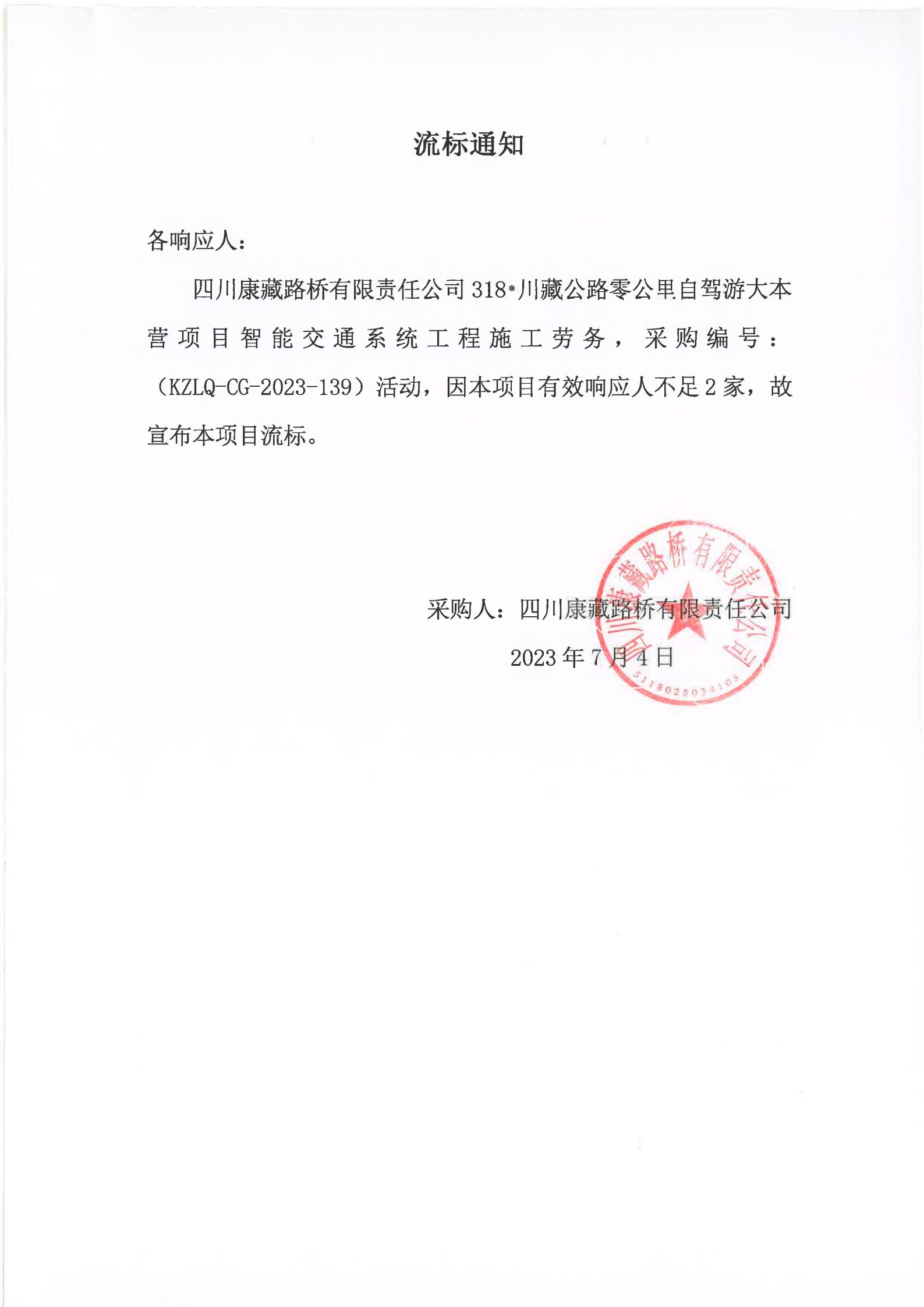 四川康藏路橋有限責任公司318·川藏公路零公里自駕游大本營項目智能交通系統(tǒng)工程施工勞務流標通知