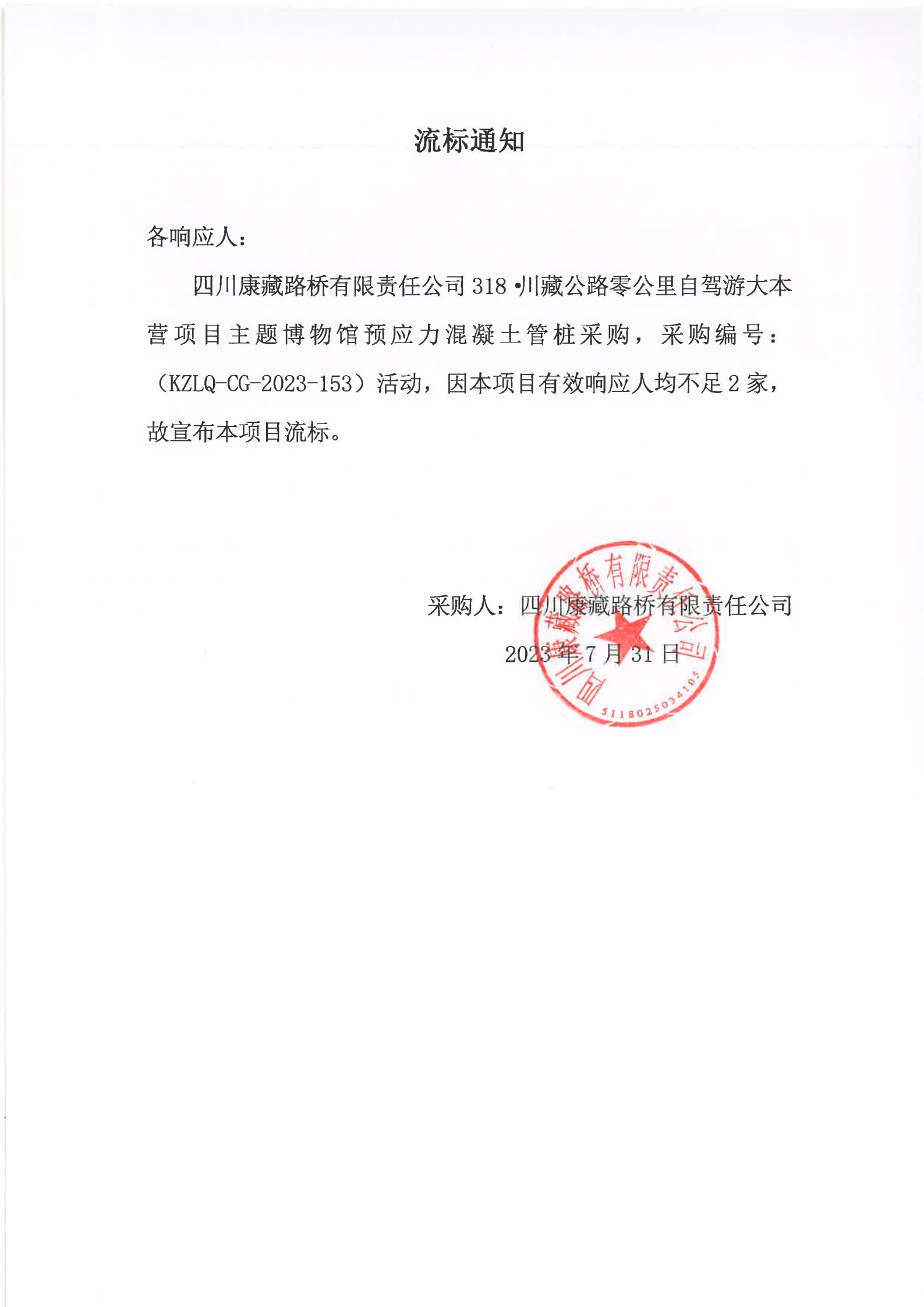 四川康藏路橋有限責(zé)任公司318·川藏公路零公里自駕游大本營項目主題博物館預(yù)應(yīng)力混凝土管樁采購流標(biāo)通知