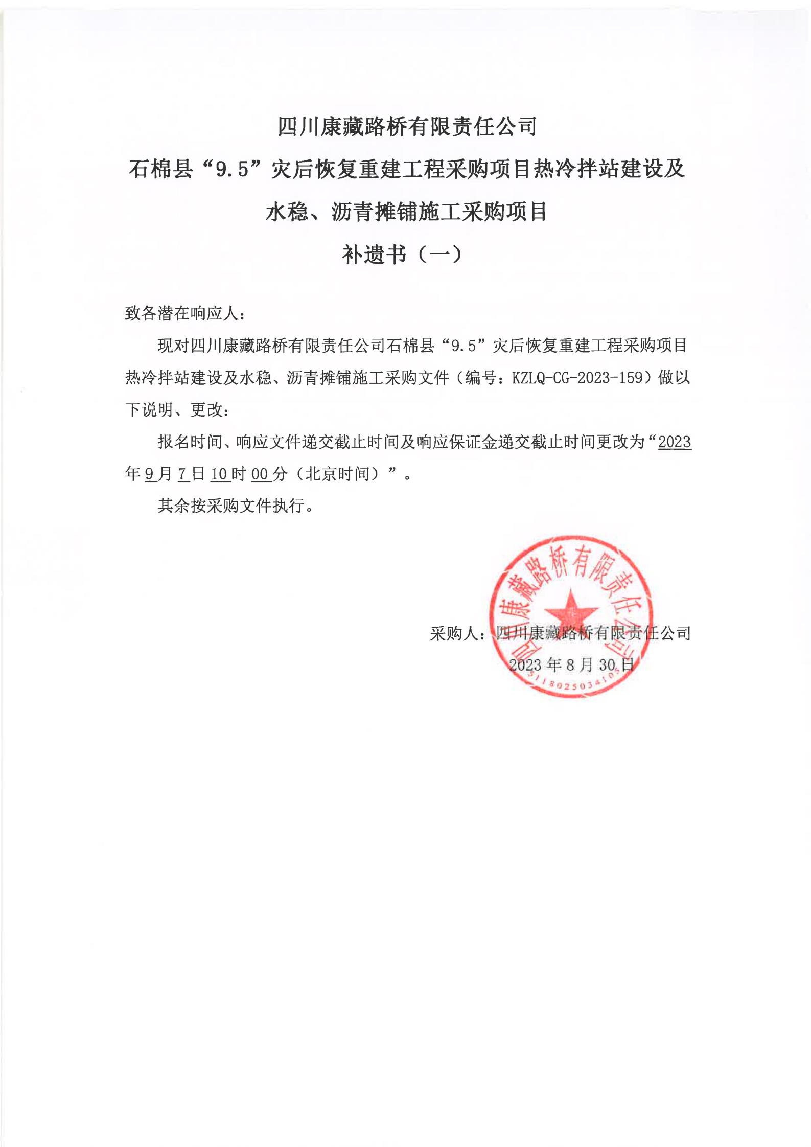 四川康藏路橋有限責(zé)任公司石棉縣“9·5”災(zāi)后恢復(fù)重建工程采購項目熱冷拌站建設(shè)及水穩(wěn)、瀝青攤鋪施工采購項目補遺書(一)