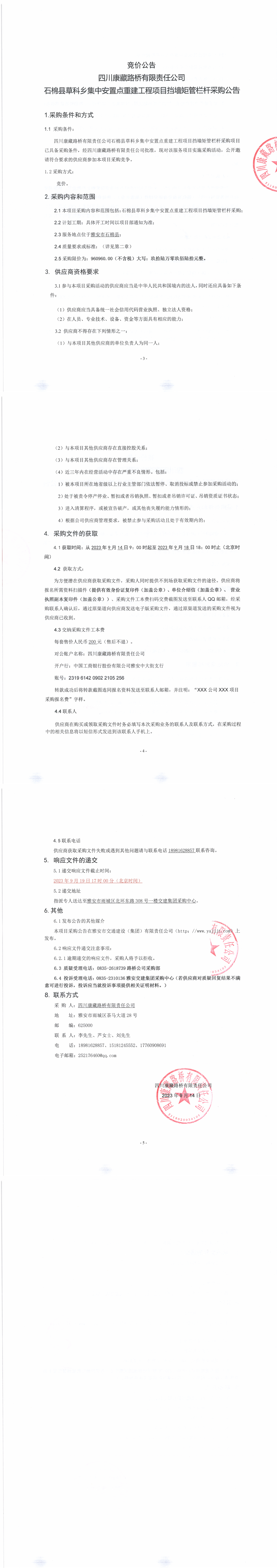 四川康藏路橋有限責(zé)任公司石棉縣草科鄉(xiāng)集中安置點(diǎn)重建工程項目擋墻矩管欄桿采購公告
