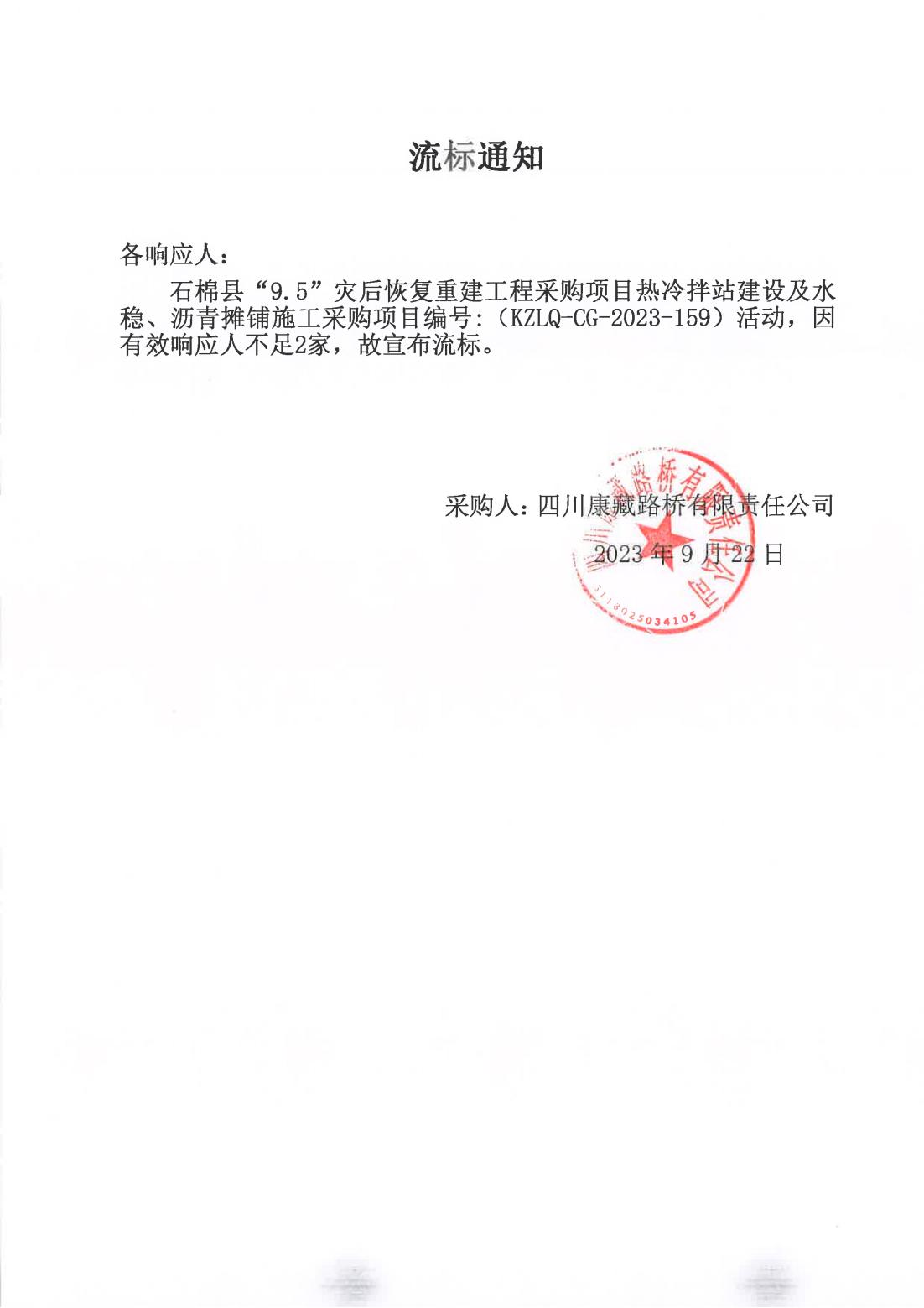 四川康藏路橋有限責任公司石棉縣“9·5”災后恢復重建工程采購項目熱冷拌站建設及水穩(wěn)、瀝青攤鋪施工采購流標通知