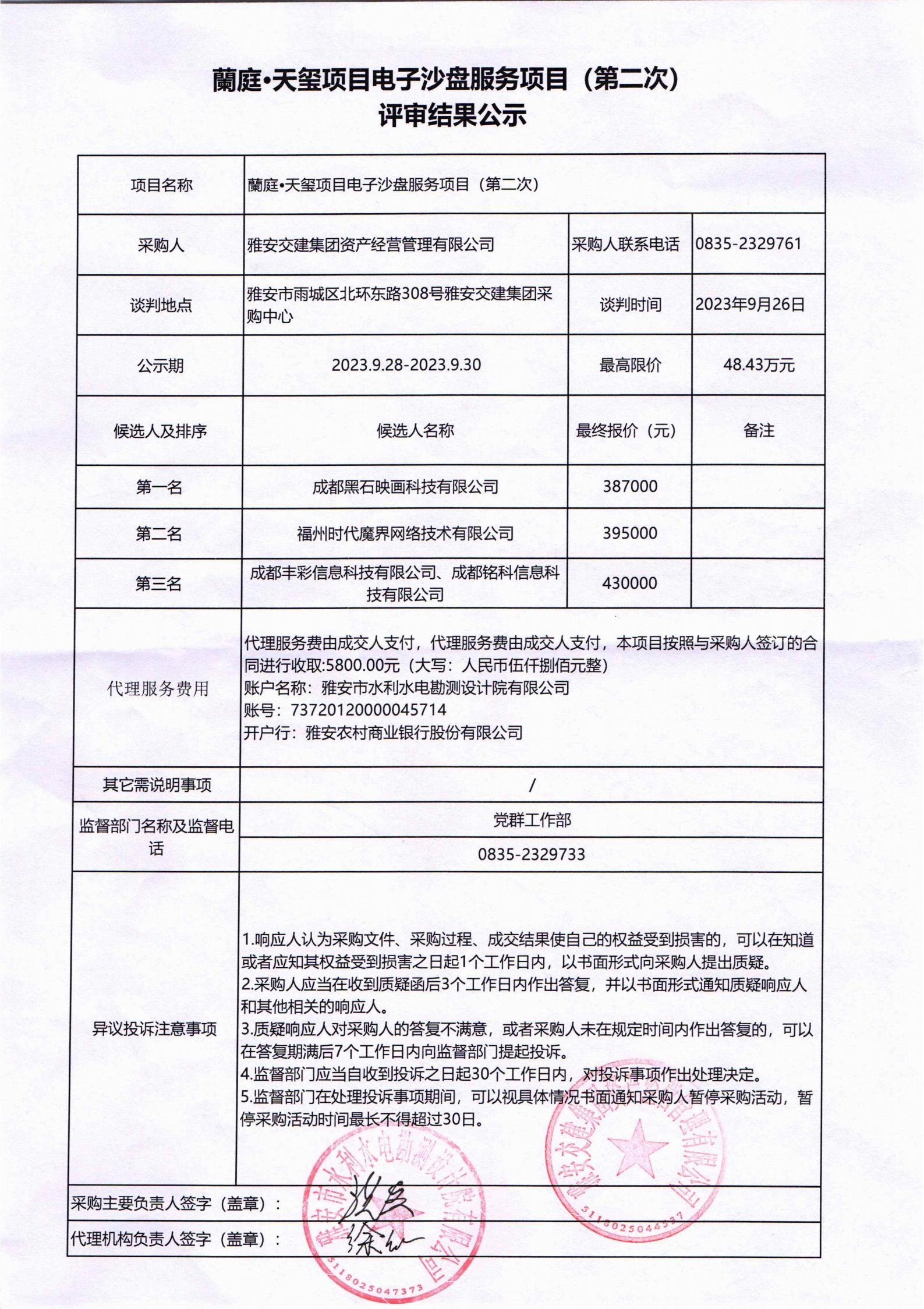 雅安交建集團資產(chǎn)經(jīng)營管理有限公司蘭庭•天璽項目電子沙盤服務項目(第二次)評審結(jié)果公示