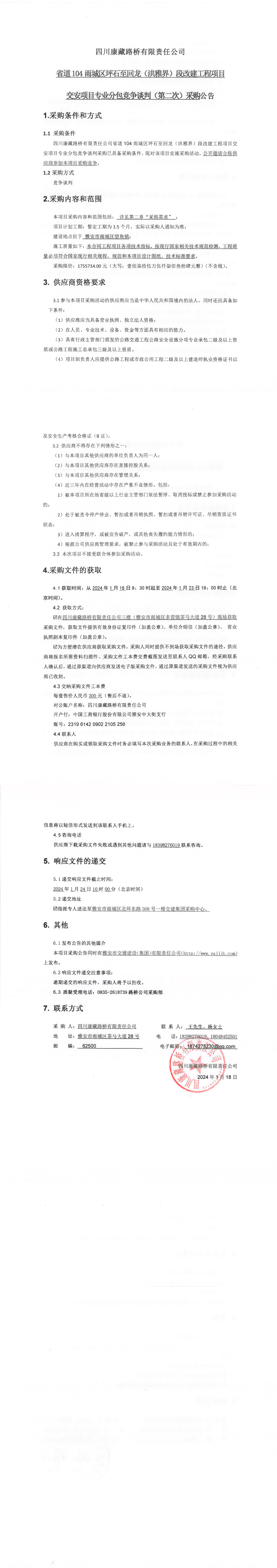 四川康藏路橋有限責(zé)任公司省道104雨城區(qū)坪石至回龍(洪雅界)段改建工程項(xiàng)目交安項(xiàng)目專業(yè)分包競(jìng)爭(zhēng)談判(第二次)采購公告