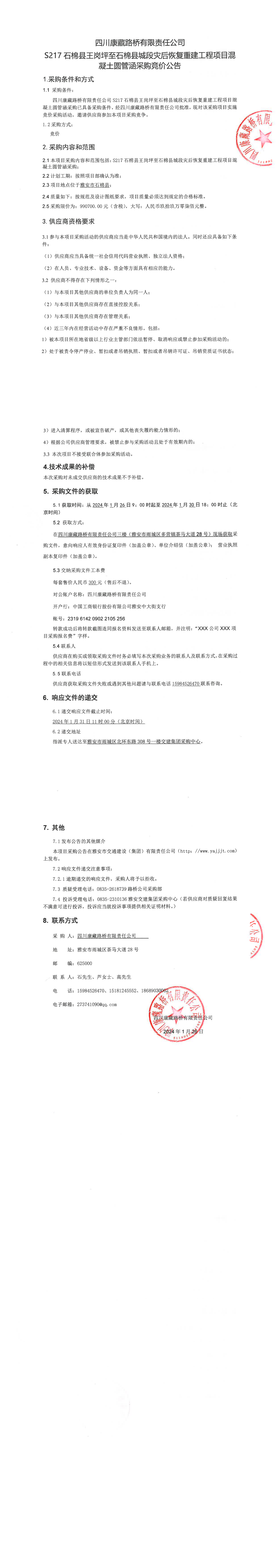 四川康藏路橋有限責任公司S217石棉縣王崗坪至石棉縣城段災(zāi)后恢復(fù)重建工程項目混凝土圓管涵采購競價公告