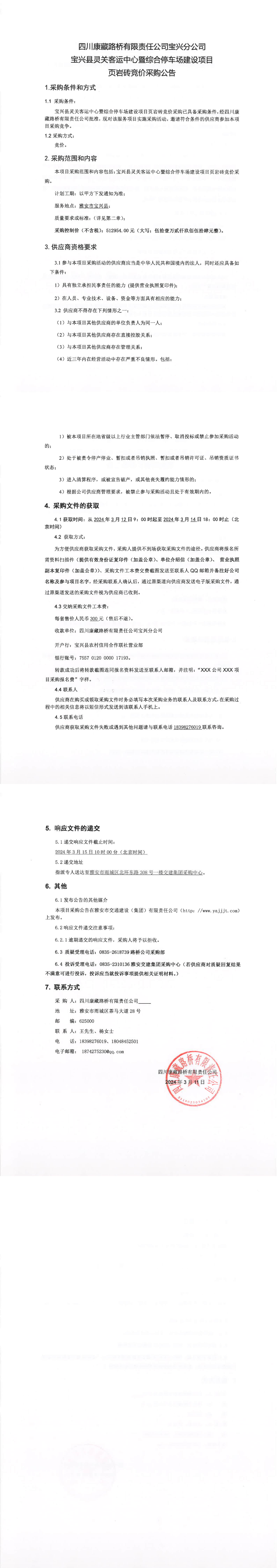 四川康藏路橋有限責(zé)任公司寶興縣靈關(guān)客運(yùn)中心暨綜合停車場(chǎng)建設(shè)項(xiàng)目頁巖磚競(jìng)價(jià)采購公告