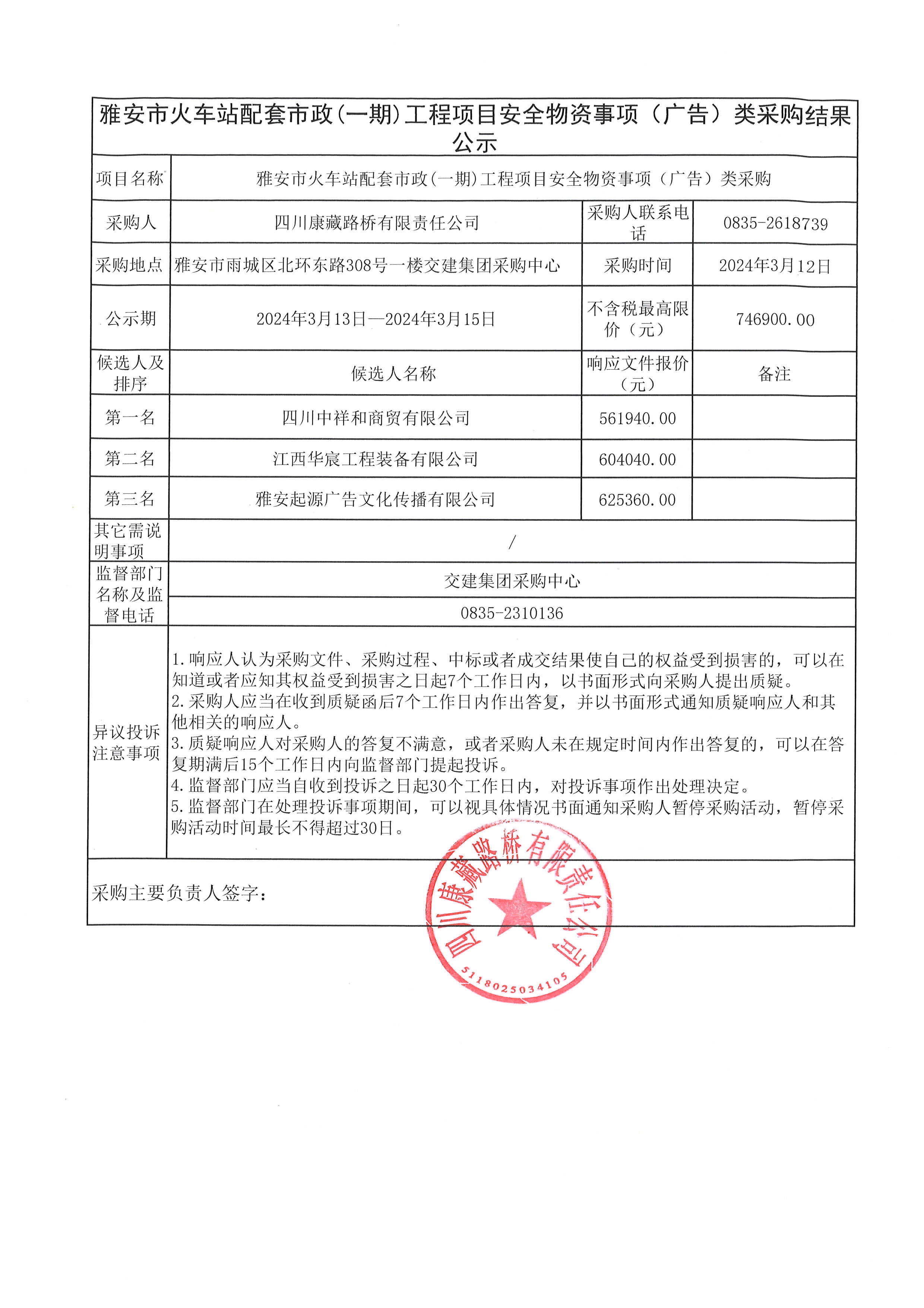 四川康藏路橋有限責(zé)任公司雅安市火車站配套市政(一期)工程項目安全物資(廣告)采購結(jié)果公示