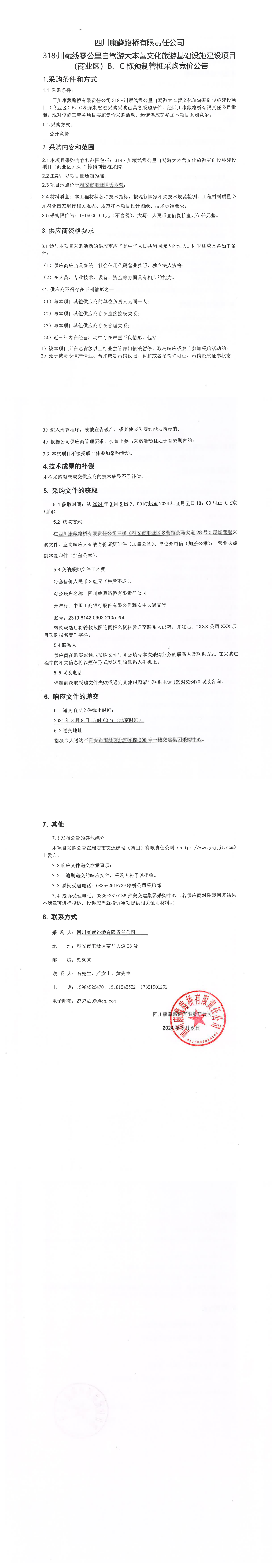 四川康藏路橋有限責(zé)任公司318·川藏公路零公里自駕游大本營文化旅游基礎(chǔ)設(shè)施建設(shè)項(xiàng)目(商業(yè)區(qū))B\C棟預(yù)制管樁采購競價(jià)公告