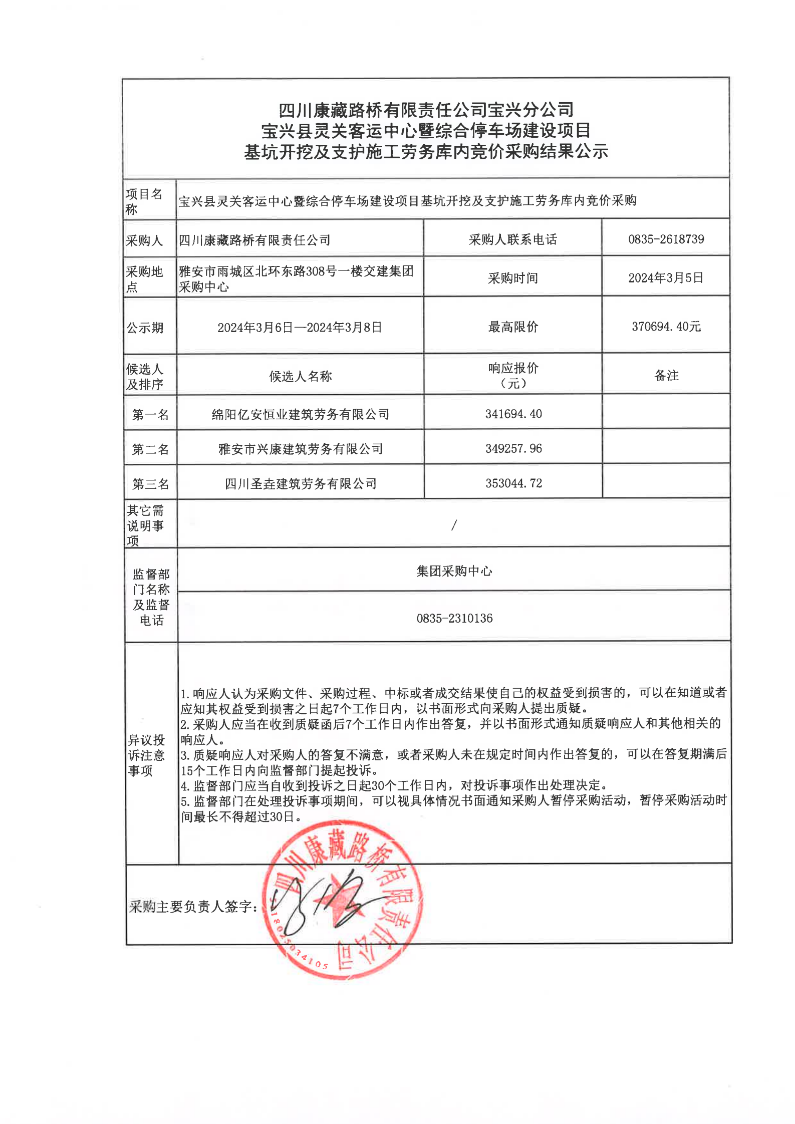 四川康藏路橋有限責(zé)任公司寶興縣靈關(guān)客運(yùn)站中心暨綜合停車(chē)場(chǎng)建設(shè)項(xiàng)目基坑降水施工勞務(wù)庫(kù)內(nèi)競(jìng)價(jià)采購(gòu)結(jié)果公示