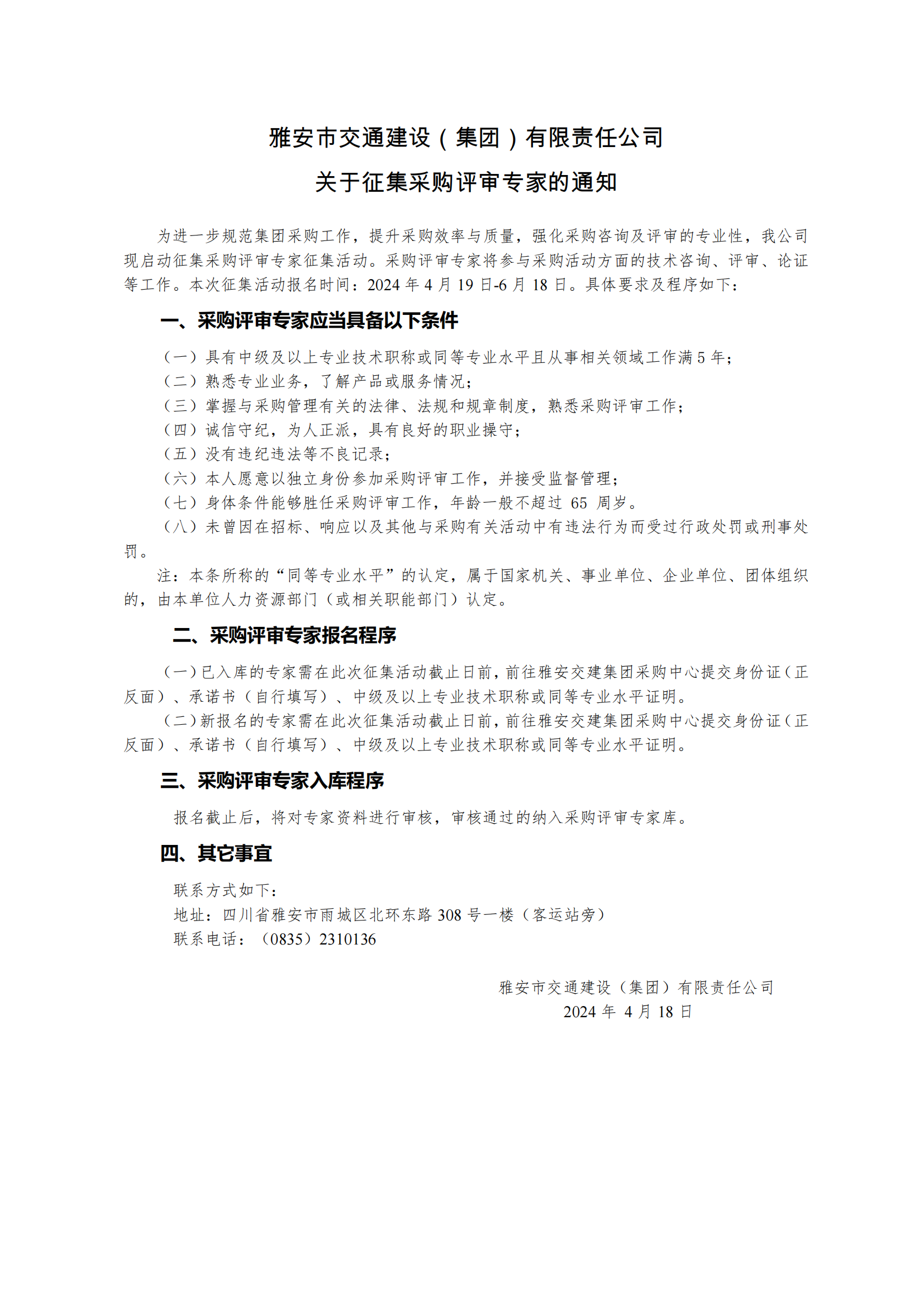 雅安市交通建設(shè)(集團(tuán))有限責(zé)任公司關(guān)于征集采購評審專家的通知