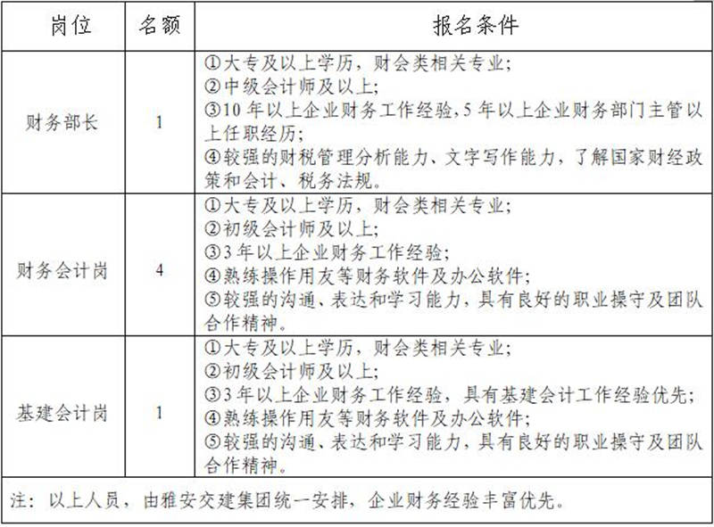 根據發(fā)展需要,決定面向社會公開招聘雅安市交通建設(集團)有限責任公司(以下簡稱“雅安交建集團”)所屬子公司財務部門負責人1名,工作人員5名,現(xiàn)將有關事項公告如下:
