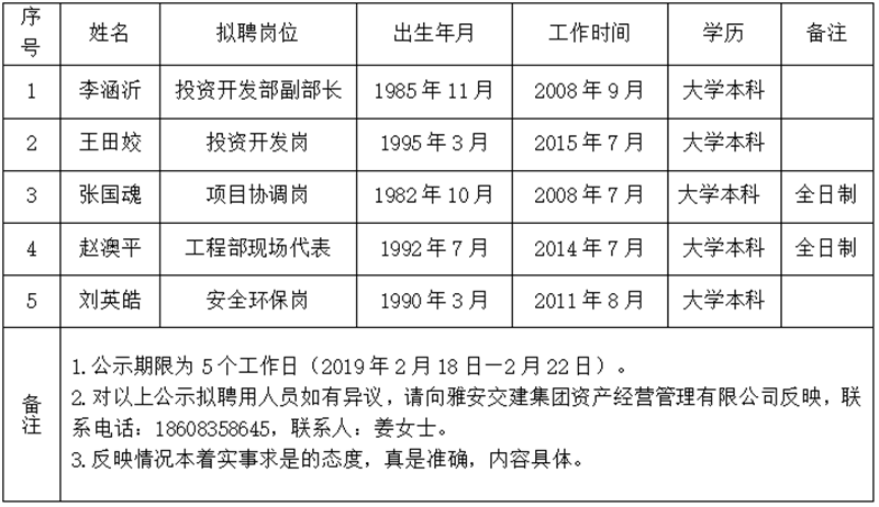 通過公開報(bào)名、資格審查、筆試、面試等程序,經(jīng)雅安交建集團(tuán)資產(chǎn)經(jīng)營管理有限公司研究,對(duì)以下