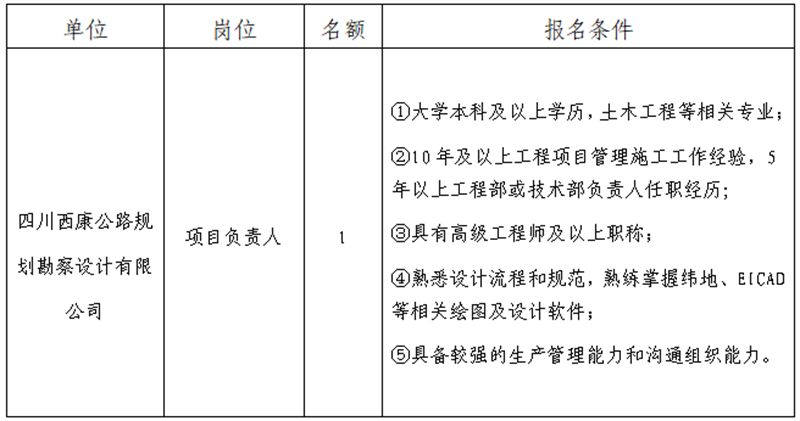 根據(jù)發(fā)展需要,決定面向社會公開招聘雅安市交通建設(shè)(集團(tuán))有限責(zé)任公司(以下簡稱“雅安交建集團(tuán)”)所屬子公司項目負(fù)責(zé)人1名,現(xiàn)將有關(guān)事項公告如下: