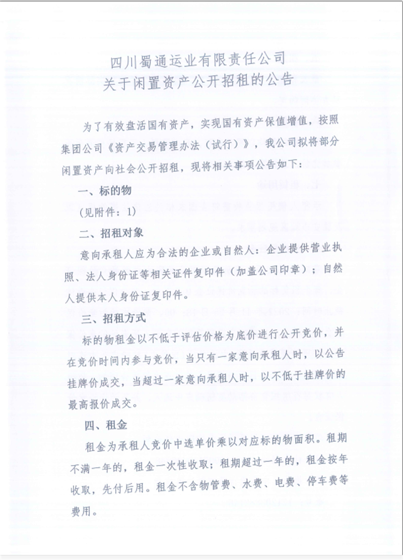 蜀通工作閑置資產(chǎn)招租公告