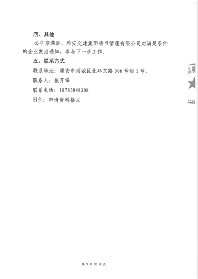 雅安交建集團(tuán)項目管理有限公司股權(quán)收購事項(第三次)征集公告