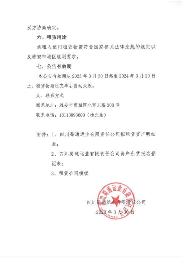 蜀通運(yùn)業(yè)有限責(zé)任公司關(guān)于閑置資產(chǎn)公開(kāi)招租的公告附件