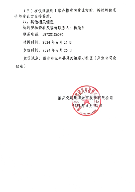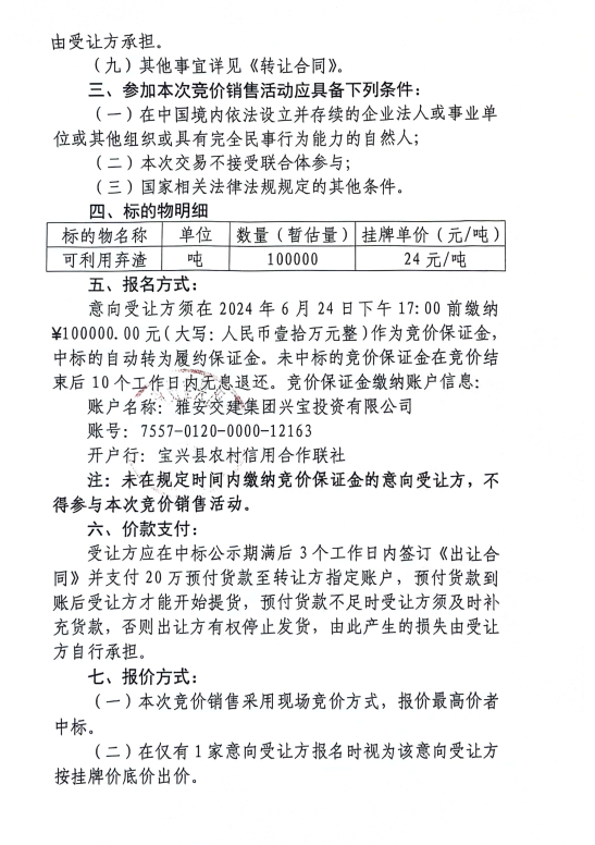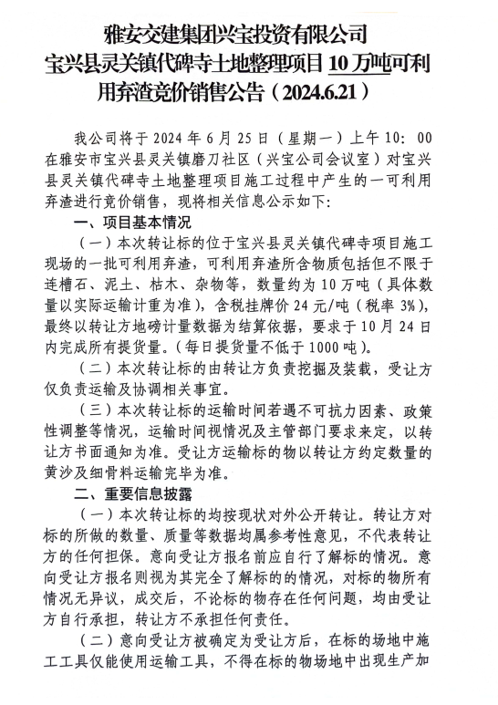 雅安交建集團興寶投資有限公司寶興縣靈關(guān)鎮(zhèn)代碑寺土地整理項目10萬噸可利用棄渣競價銷售公告(2024.6.21)