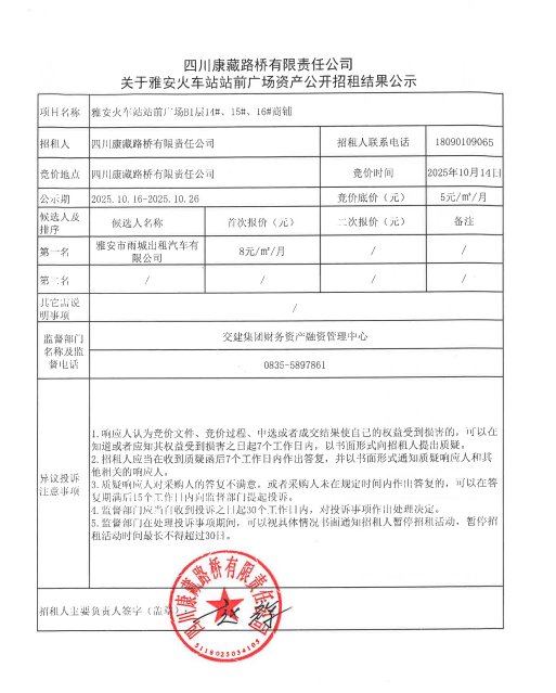 四川康藏路橋有限責(zé)任公司關(guān)于雅安火車站站前廣場(chǎng)資產(chǎn)公開招租結(jié)果公示