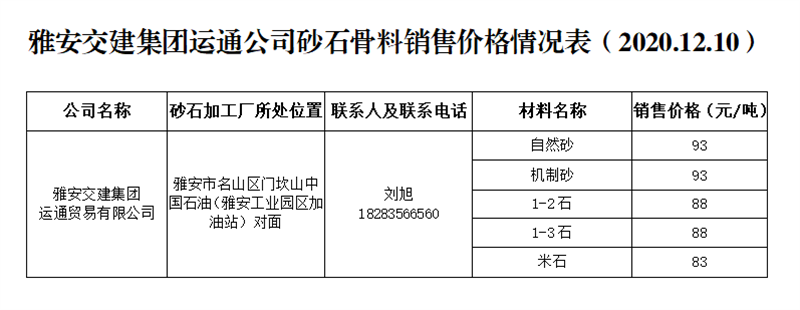 雅安交建集團(tuán)運(yùn)通公司砂石骨料銷售價(jià)格情況表(2020.12.10)