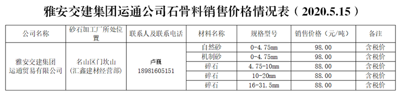 運通貿易有限公司。運通公司是雅安市交通建設(集團)有限責任公司獨資子公司,主要負責雨城區(qū)中心城區(qū)河道外砂石經(jīng)營管理工作。目前,公司與名山區(qū)匯鑫建材經(jīng)營部確定了代加工合作關系,已投產(chǎn),預計年生產(chǎn)能力約30萬噸。