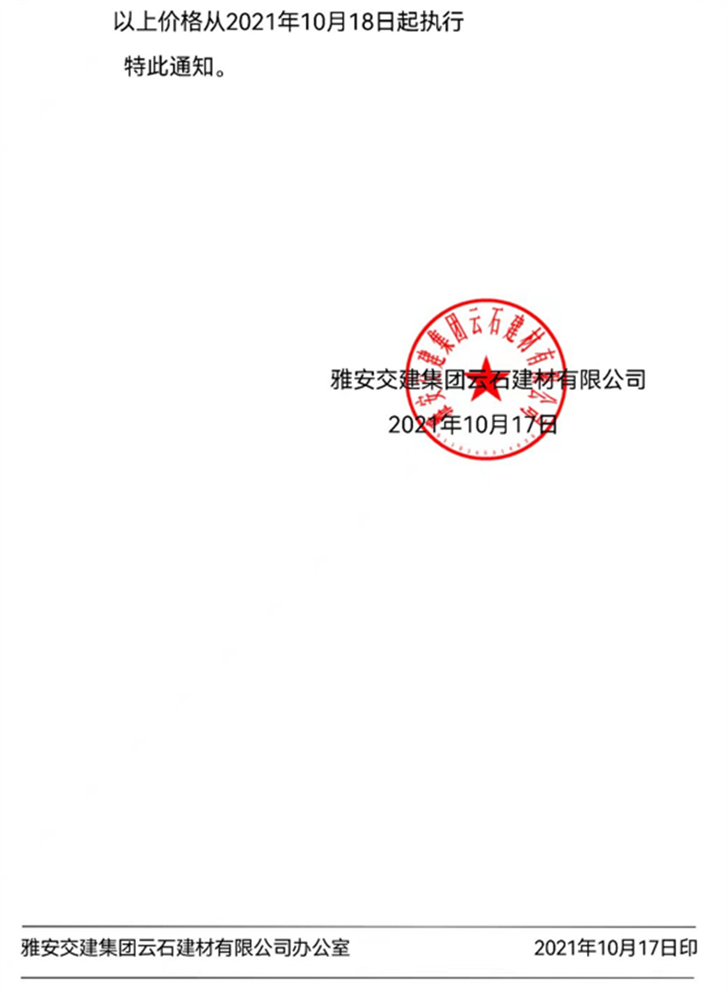 ÑŰ²½»½¨¼¯ˆF(tu¨¢n)ÔÆÊ¯¹«Ë¾êP(gu¨¡n)ÓÚÕ{(di¨¤o)Õû³ÉÆ·ÁÏäNÊÛƒr(ji¨¤)¸ñµÄ֪ͨ£¨2021.11.4£©