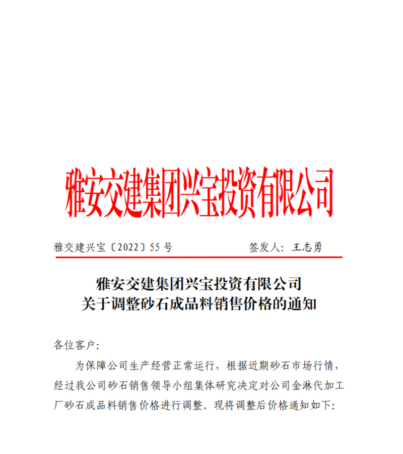 雅交建興寶〔2022〕55號 關于調整砂石成品料銷售價格的通知-11.5
