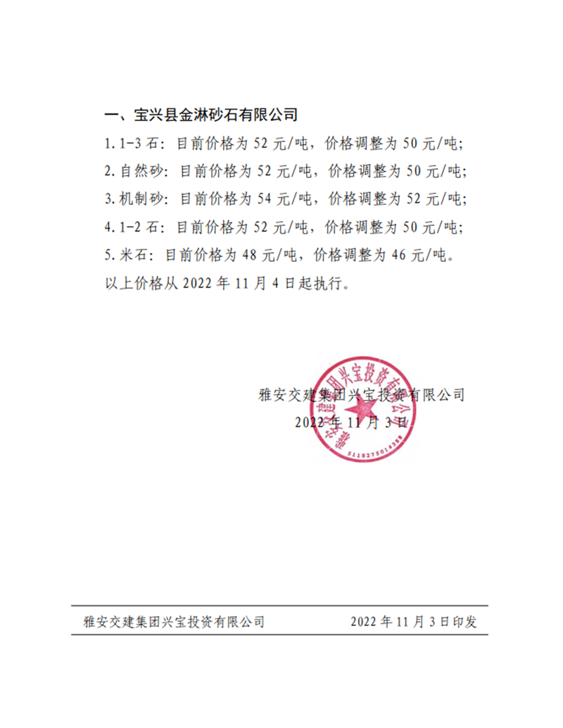 雅交建興寶〔2022〕44號 關于調整砂石成品料銷售價格的通知10.17
