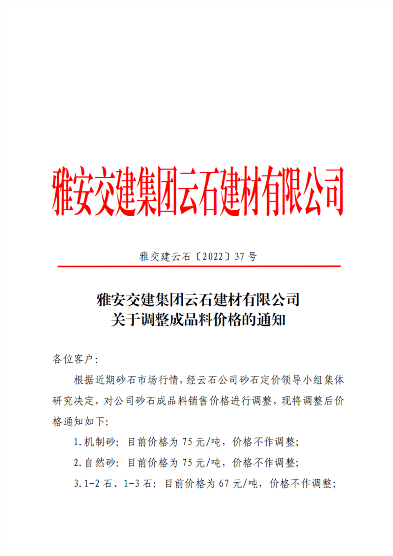 雅安交建集團云石建材有限公司 關于調整成品料價格的通知--2022-5-25