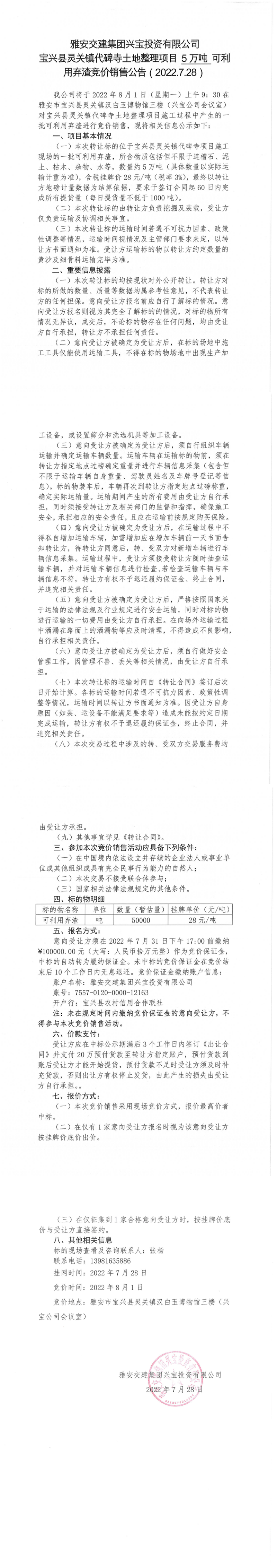 雅安交建集團(tuán)興寶投資有限公司靈關(guān)鎮(zhèn)代碑寺土地整理項(xiàng)目5萬(wàn)噸可利用棄渣競(jìng)價(jià)銷售公告(2022.7.28)