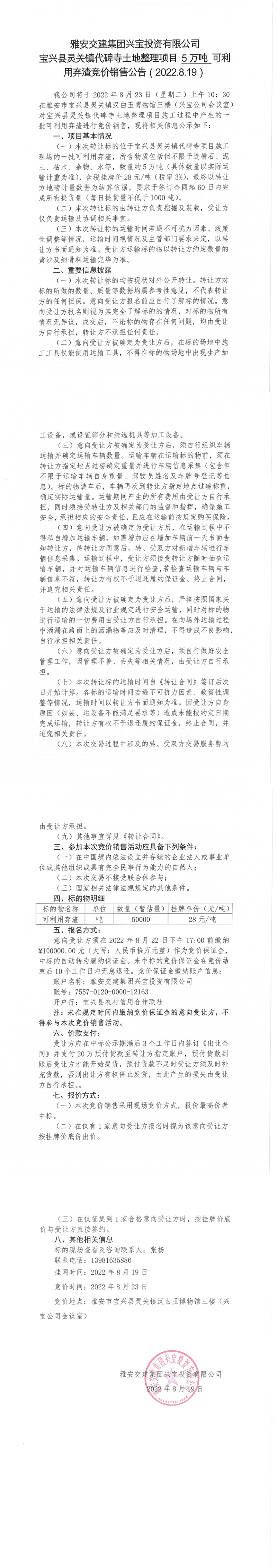 雅安交建集團(tuán)興寶投資有限公司靈關(guān)鎮(zhèn)代碑寺土地整理項(xiàng)目10萬(wàn)噸可利用棄渣競(jìng)價(jià)銷(xiāo)售公告(2022.8.19)(1)