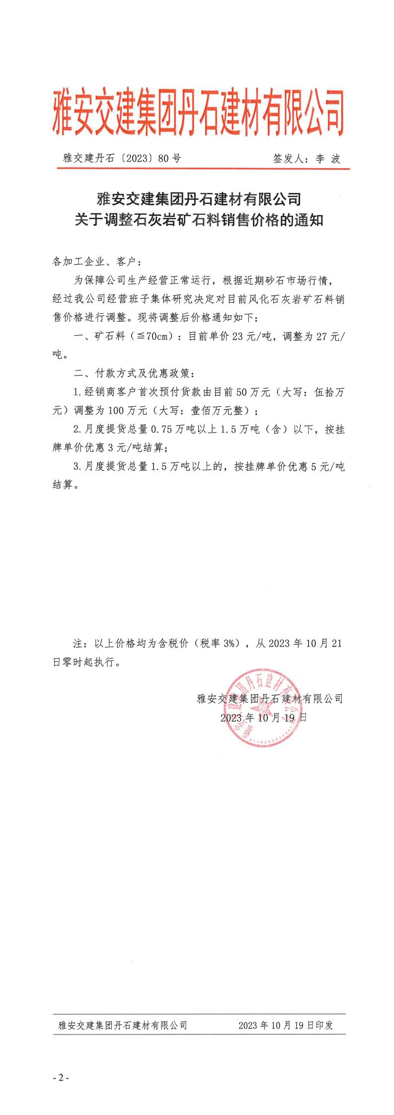 雅安交建丹石公司關(guān)于石灰?guī)r礦石料調(diào)價(jià)的通知--2023.10.20